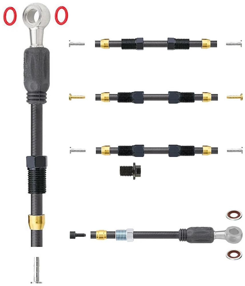 - Die Sport Hydraulikleitungssets enthalten eine 2000 mm Hydraulikleitung (HPP) inkl. aller benötigten Adapter Bremssattel- und Hebel-seitig für die angegebene Bremse