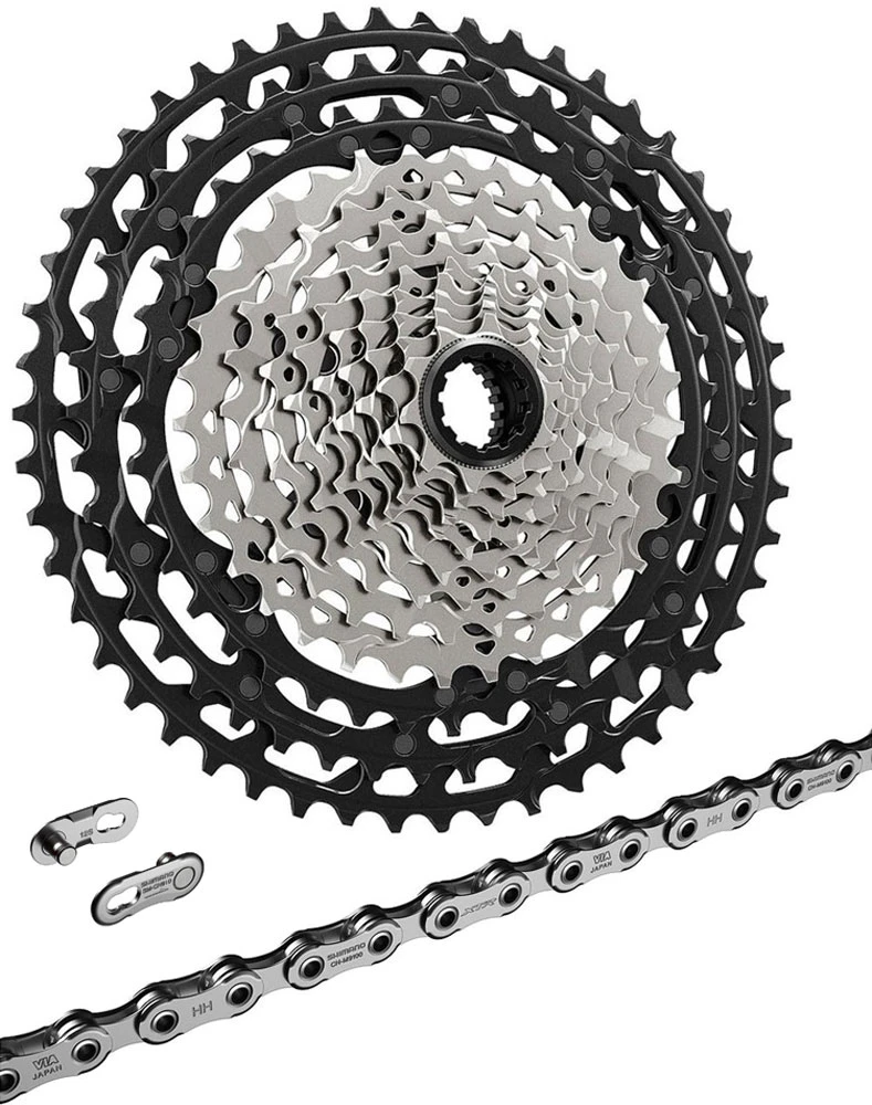 Verschleissset für Shimano 12-fach Antrieb bestehend aus der XTR CS-M9100 12-fach Kassette in verschiedenen Abstufungen und der XTR CN-M9100 Kette mit 126 Gliedern.